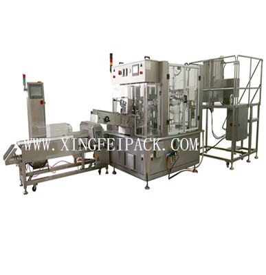 包裝流程(工位分布):1)上袋—2)色帶(噴碼)打碼(選項)—3)開自立袋底—4)開袋口—5)一次充填—6)二次充填(選項或者備用)—7)熱封口(同時排氣)—8)冷封口和產(chǎn)品輸出。