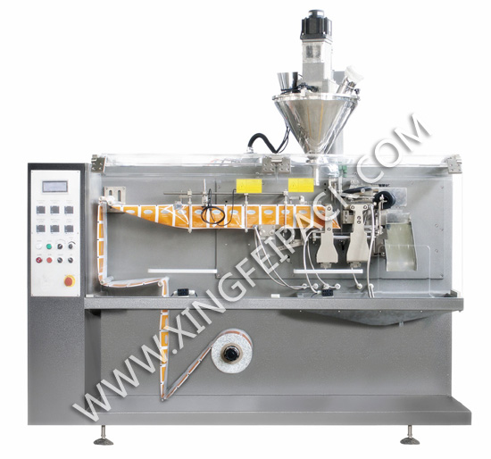 全自動水平式包裝機是一款水平式全自動卷膜成型袋包裝機,是集制袋、計量、灌裝、封口于一體的全新自動包裝機。以熱封性復合膜材料為外包裝,配置各種不同的灌裝頭,可對粉狀、顆粒、液體、粘稠體等不同的物料進行三邊封或四邊封包裝。